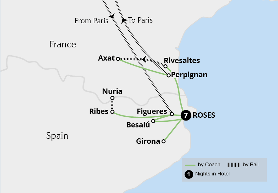 From the coastal town of Roses, discover the glistening Catalan coast and ride into the Pyrenees, taking in the stunning scenery of France and Spain on this relaxing holiday. Journey through peaceful landscapes on the Núria Valley Rack Railway and ride the Little Red Train from Rivesaltes to Axat in France's Pyrenean foothills. Explore...