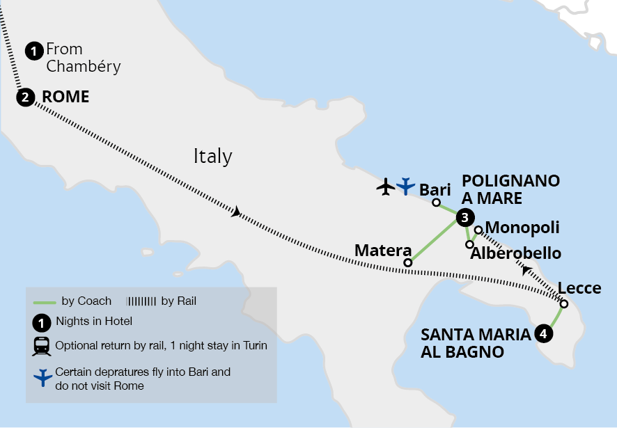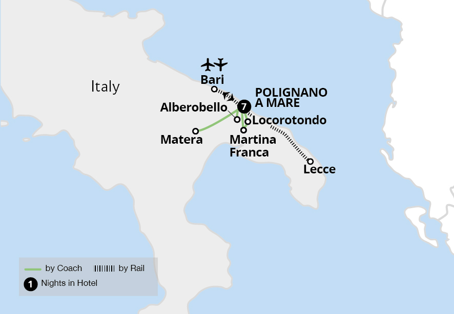 Arriving by plane, enjoy our scenic base in a hotel overlooking the coast of Monopoli. From here, experience the incredible sights and traditions of Puglia, a place untouched by the hands of time. Rich with UNESCO World Heritage sites, discover the spectacular trulli homes of Alberobello and the sassi cave dwellings in the cliffside town of...