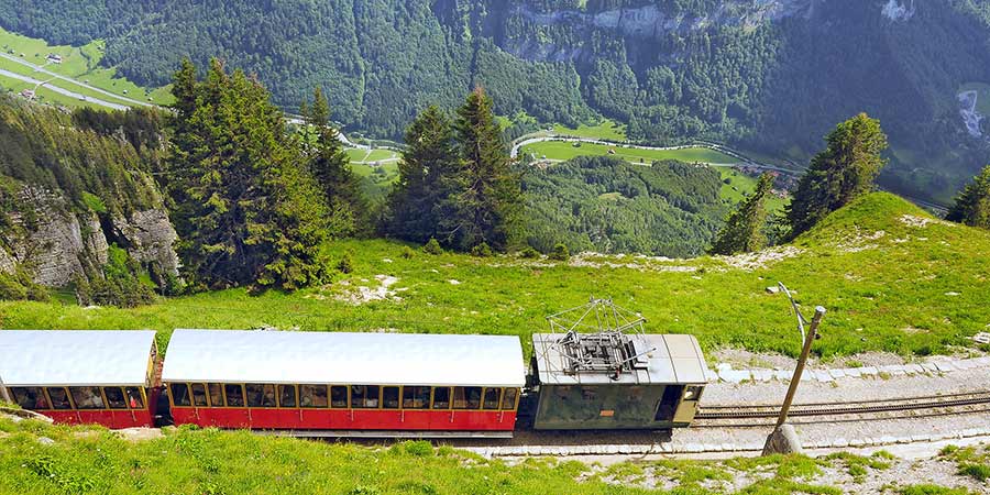 The journey to Schynige Platte is an unforgettable experience in itself. The Schynige Platte Railway, inaugurated in May 1893, gently climbs to an altitude of almost two thousand metres over its seven-mile route. On the way, this historic cog railway ascends forested hillsides, before reaching open pastures strewn with summer wildflowers and a point from which passengers gain views over Interlaken and its accompanying lakes Thun and Brienz. As the train attains the summit and nears the Schynige Platte station, the true splendour of the mountainous landscape is finally revealed.