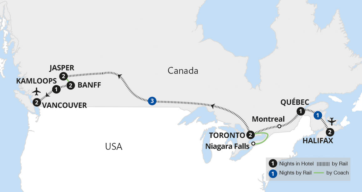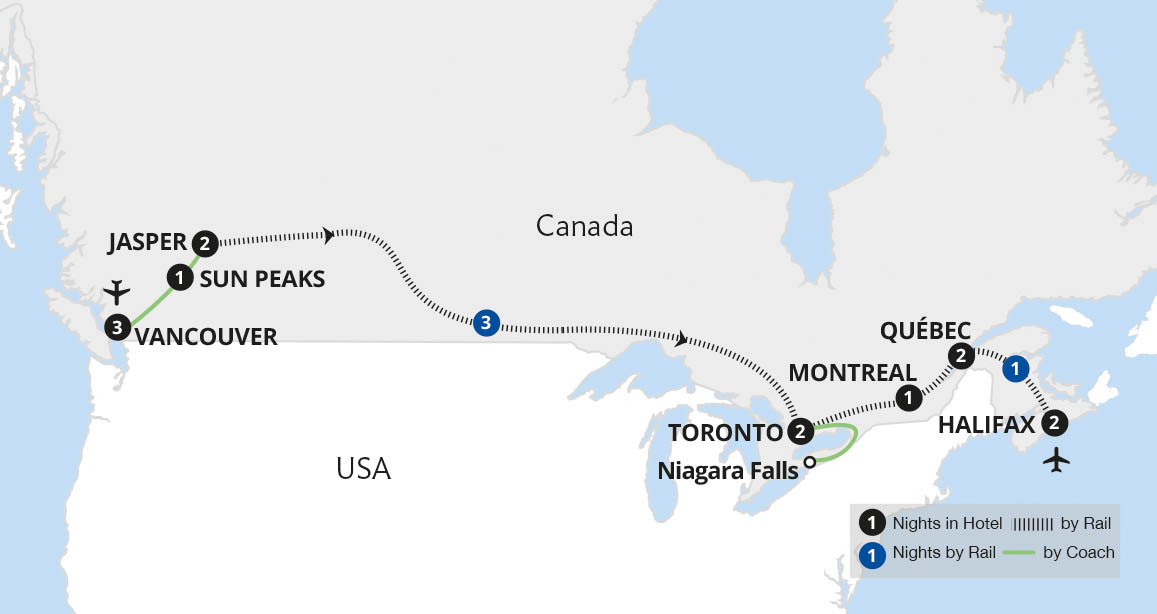 • Journey from Vancouver on the Pacific coast to Halifax on the shores of the Atlantic