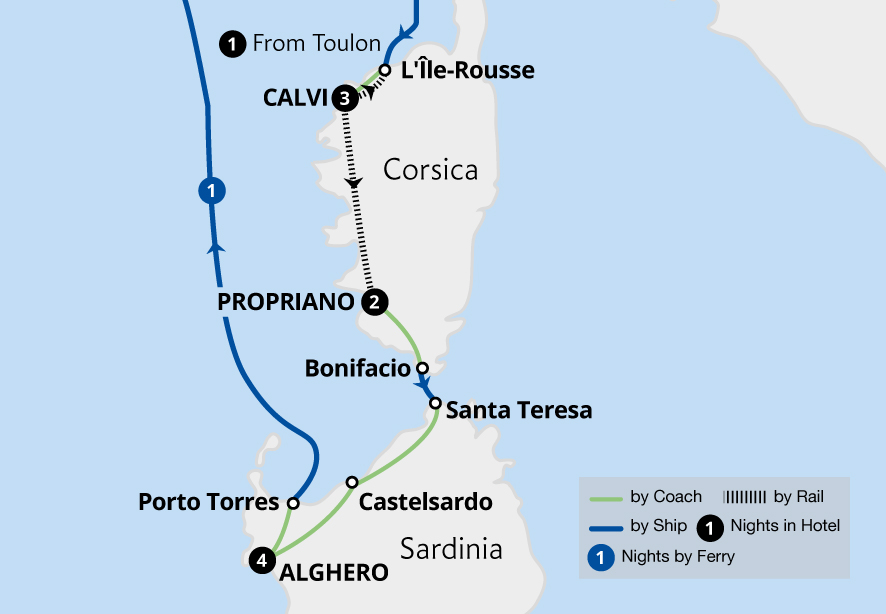Uncover the laid-back island lifestyle on a fantastic tour of this 'forgotten corner of Europe'. Explore the glistening coast of unspoilt Corsica, a paradise of old-world French towns and hilltop villages, connected by charming train journeys through spectacular scenery. Indulge in the delicious cuisine of Sardinia, discover beautiful historic...