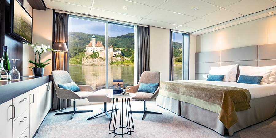 These cabins are impressively spacious when compared to other river ships. Found on the on Strauss and Mozart Decks, each features floor-to-ceiling, sliding glass doors as well as a French-style balcony.