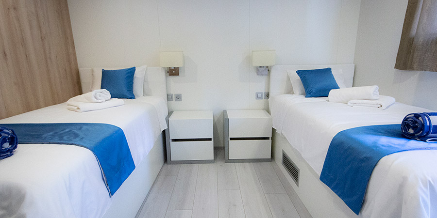 Cabins feature air-conditioning, a safe, an audio system, a wardrobe, desk, sofa, and a window. En-suite bathrooms include a shower and a hairdryer and beds can be configured to twins or a double.