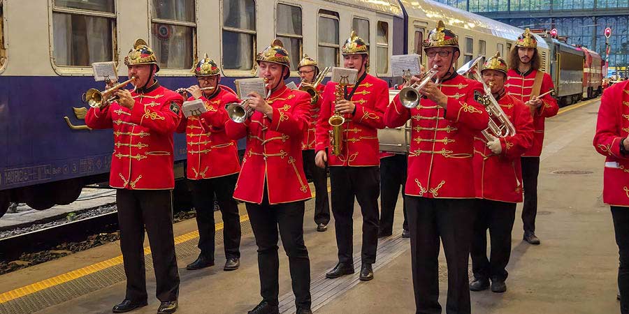 "You are welcomed by a saxophonist playing jazz music as you approach the platform on the red carpet. The train was already there waiting, with all the staff lined up outside to personally introduce themselves to each guest. There was also a little brass band playing music as you arrived at Budapest station at the end.