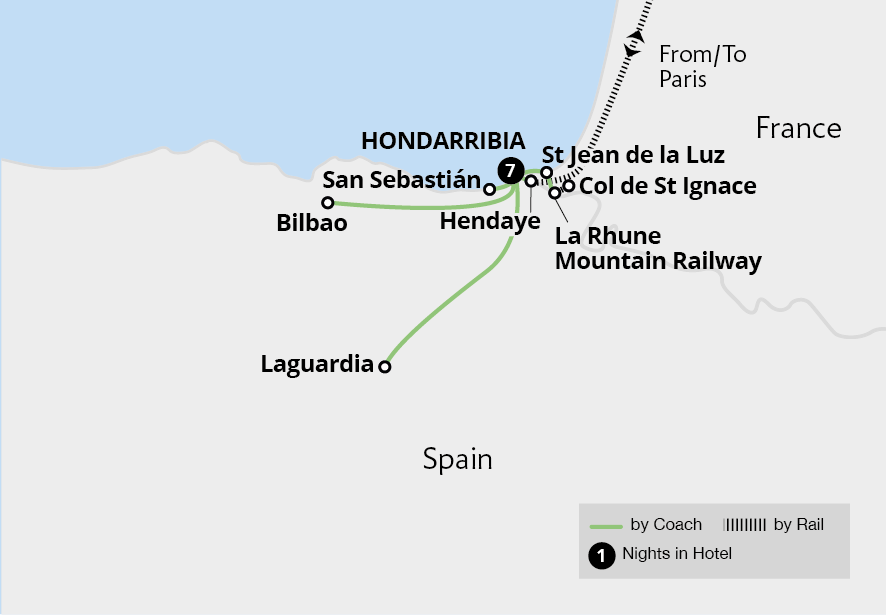 We meet the Tour Manager and fellow travellers this morning at London St Pancras, ready to board the Eurostar to Paris. Travelling in spacious Plus class, we are served a light meal at our seats. From Paris, we continue by First Class rail to the coastal French town of Hendaye, situated on a scenic estuary which marks the Spanish border. Arriving in the early evening, we're met by a coach to take us over the border to Hondarribia, where we spend the next seven nights.