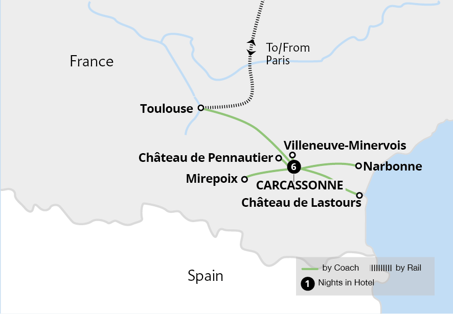 We return to our hotel mid-afternoon and the rest of the day is at leisure to enjoy the sights of Carcassonne's walled city as dusk descends or perhaps to revisit a favourite restaurant.