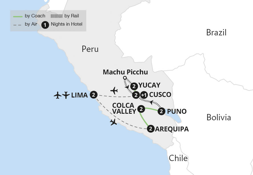 Uncover Lima, Peru's colourful and historic capital, and the shimmering 'White City' of Arequipa before heading high into the Andes to the breathtaking Colca Canyon, where majestic condors soar.