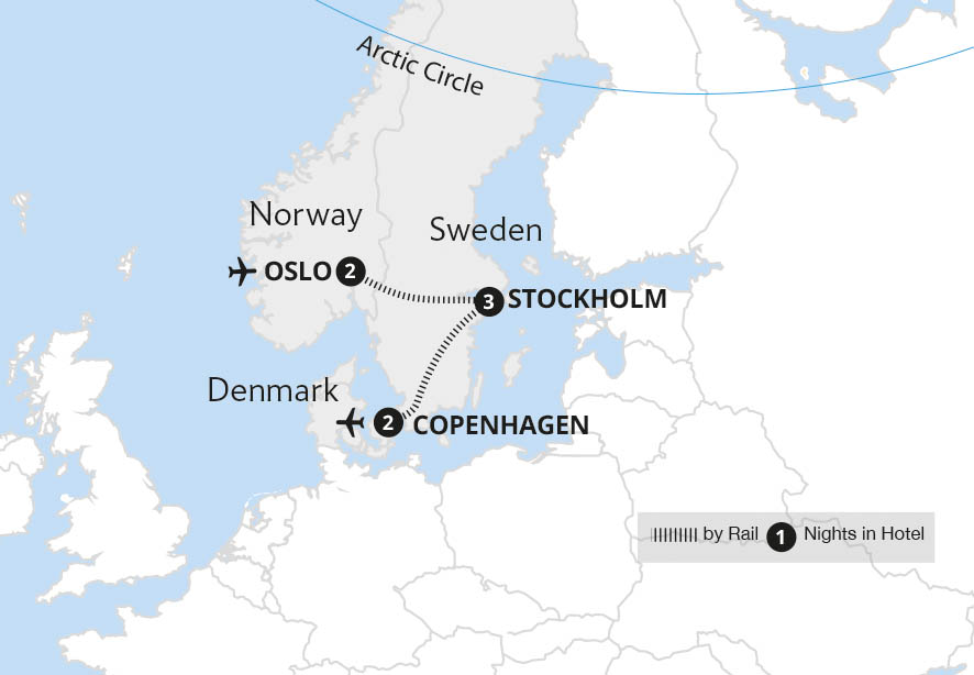 Discover evocative Scandinavian landscapes on picturesque rail journeys, between the cultured capitals of Norway, Sweden and Denmark. Starting in Oslo, uncover its stylish modernity and thousand-year history on a guided tour, before travelling by rail to majestic Stockholm.