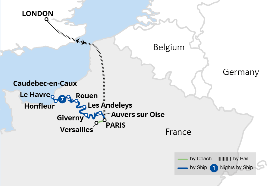 This Seine cruise has been one of great beauty, endless culture and remarkable locations. Having walked the quaint streets of Auvers-sur-Oise, explored the historic marvels of Rouen, and seen places like Honfleur's picturesque harbour, the Cliffs of Étretat, Château Gaillard's medieval splendour, and Monet's Garden, your holiday draws to a close as the Eurostar arrives in London this afternoon.