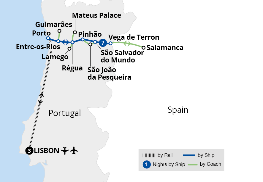 We set sail from Porto, tracing the Douro's path. Visit the golden city of Salamanca, discover Baroque architecture in Lamego, indulge in wine at local Quintas and spend time in medieval Guimarães - each stop offering a take on the beauty of the Douro Valley.