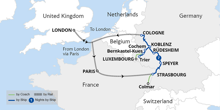 This beautifully scenic, easy-paced cruise takes us to the towns and cities of the River Rhine. Sailing by enchanting landscapes, discover Heidelberg and Strasbourg along with the sensational vistas of the UNESCO-listed Rhine Gorge. From Cologne, we sail south to explore the town of Koblenz, enjoy a guided tour of Heidelberg, and wander...